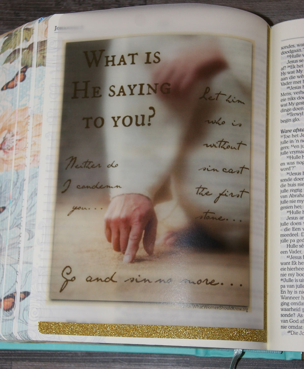 I found this amazing picture on pinterest (WhatWomanSouldKnow.org) which sums John 8 up perfectly: What is He saying to you? “Let him who is without sin cast the first stone”, “neither do I condemn you” or “go and sin no more”.